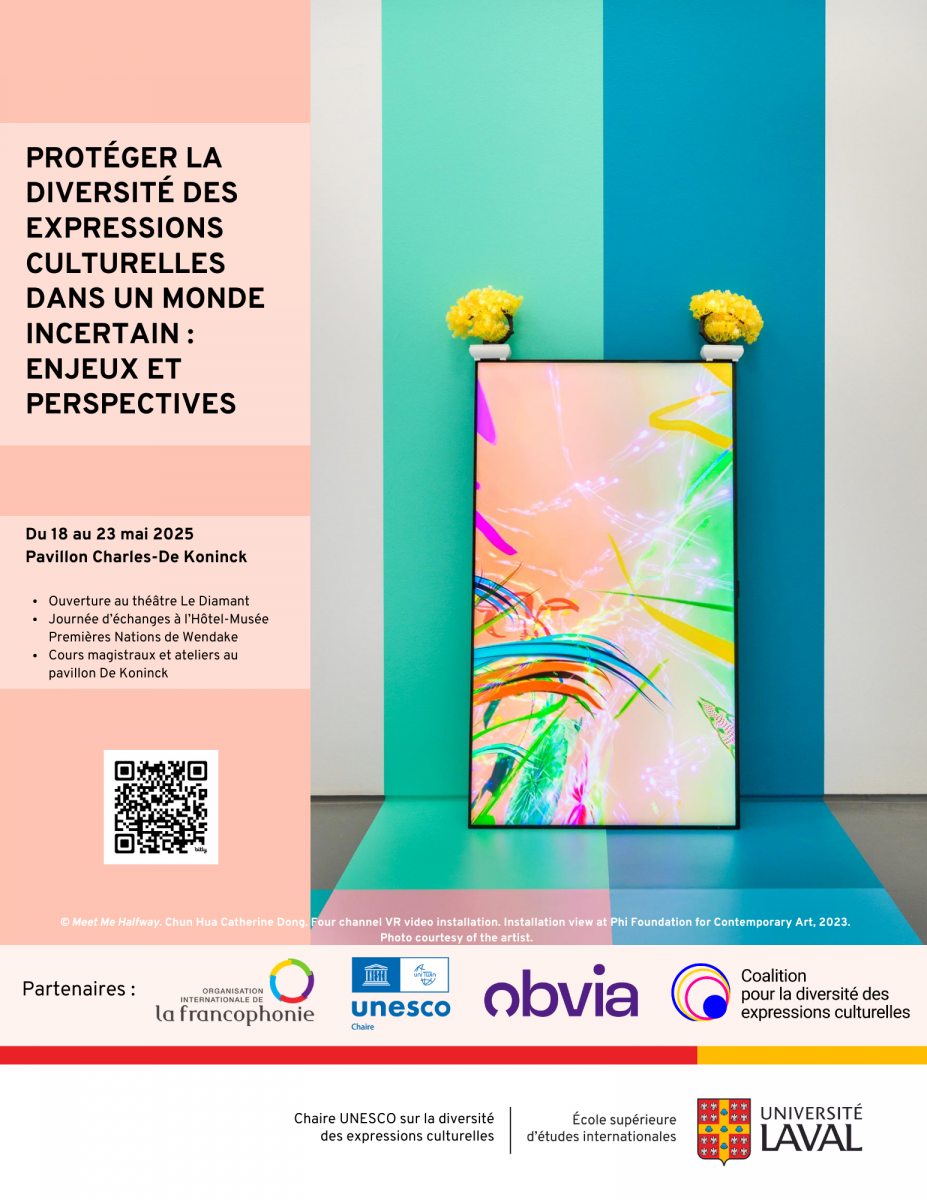 À l'occasion du 20e anniversaire de la Convention sur la protection et la promotion de la diversité des expressions culturelles, la Chaire UNESCO coorganise avec l'École supérieure d'études internationales (ESEI) de l'Université Laval, une École d'été intitulée « Protéger la diversité des expressions culturelles dans un monde incertain : enjeux et perspectives » qui aura lieu du 18 au 23 mai 2025. Elle constituera une occasion privilégiée pour revisiter le contexte ayant conduit à l’adoption de la Convention de l'UNESCO de 2005, en analyser les principes, faire le point sur l’état actuel de sa mise en œuvre, et explorer les défis que rencontrent les Parties pour atteindre ses objectifs dans un monde marqué par les technologies numériques, l’intelligence artificielle (IA) et les plateformes en ligne.